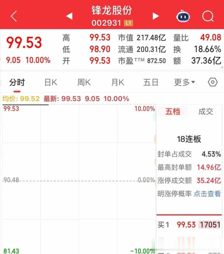 锋龙股份连续出现十八个涨停,股价从十九元涨到接近一百元,上涨超过五倍,公司曾经发布风险提示,也说明三年内不会进行重组,但投资者仍然继续买入兴盛网 ,当天股价两次打开涨停板,成交金额达到三十七亿元,换手率有百分之十八,部分原有资金选择卖出,新进资金立即接手,我观察到不少人采取越涨越买的策略,完全不考虑股票的实际价值。