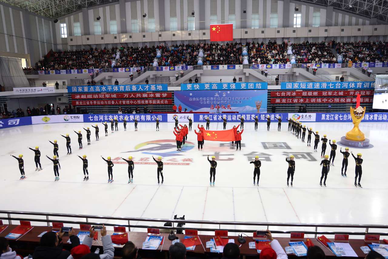 紧接着,一场精彩的冰秀展演正在进行。短道速滑运动员和教练员以灵动队形还原短道速滑训练和比赛场景,展现“奥运冠军之城”的青春活力。《我相信》《我在黑龙江等你》等昂扬的旋律点燃了全场观众的热情。
